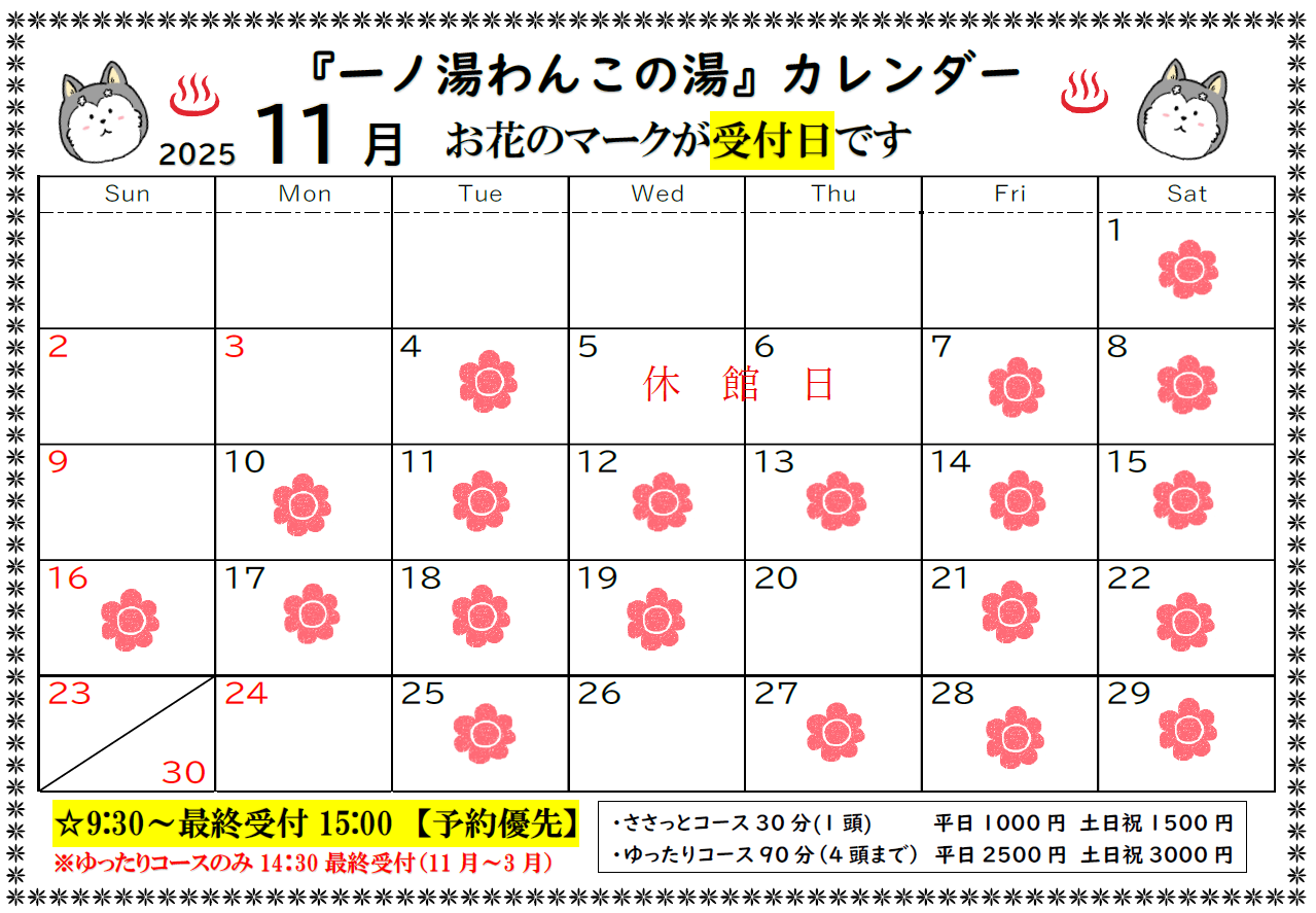 お待たせいたしました💕11月のわんこの湯受付カレンダーを更新します