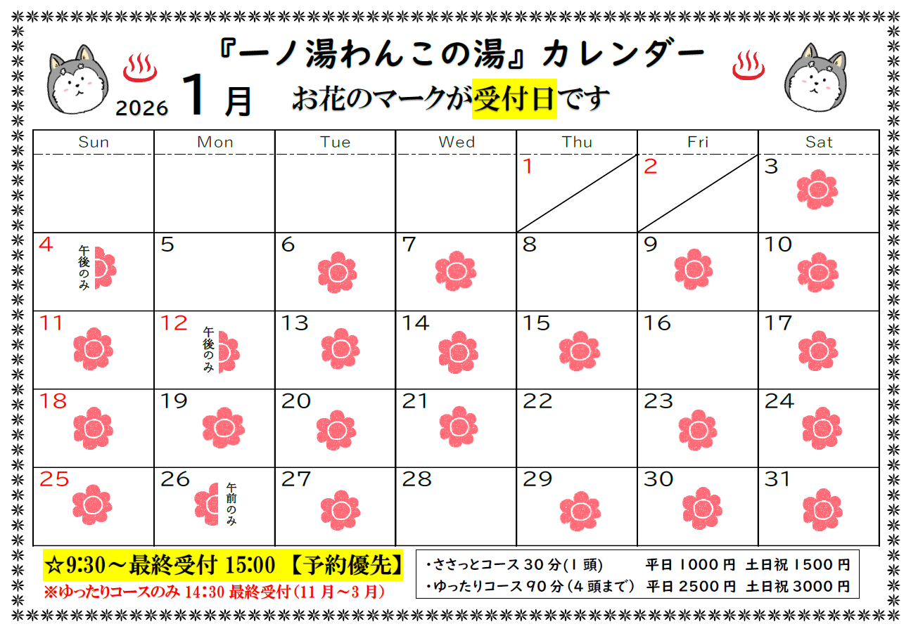 2026年1月のわんこの湯🐾の受付日を更新しました!